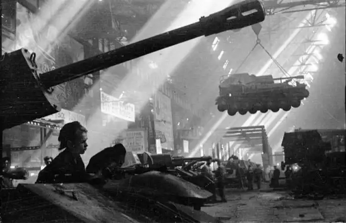 Подросток электросварщик Алексей Елов, выполняющий по 3 нормы в смену, в цеху по сборке С АУ СУ-76, Горьковский автомобильный завод, Вторая мировая