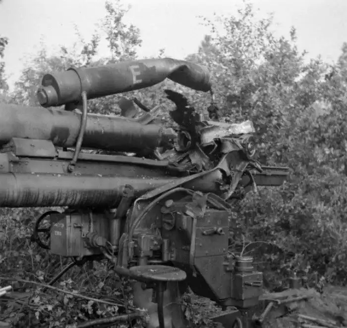 Разбитая немецкая 88-мм зенитная пушка FlaK 36 в лесу у голландского городка Алст. 1944 год.