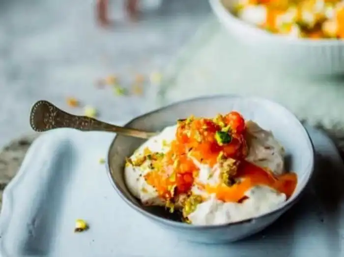 "Ум али" - ломтики слоеного теста, залитые сладким молоком и засыпанные фруктово-ореховой смесью с участием цукатов, изюма, миндаля, фисташек и кедровых орешков.