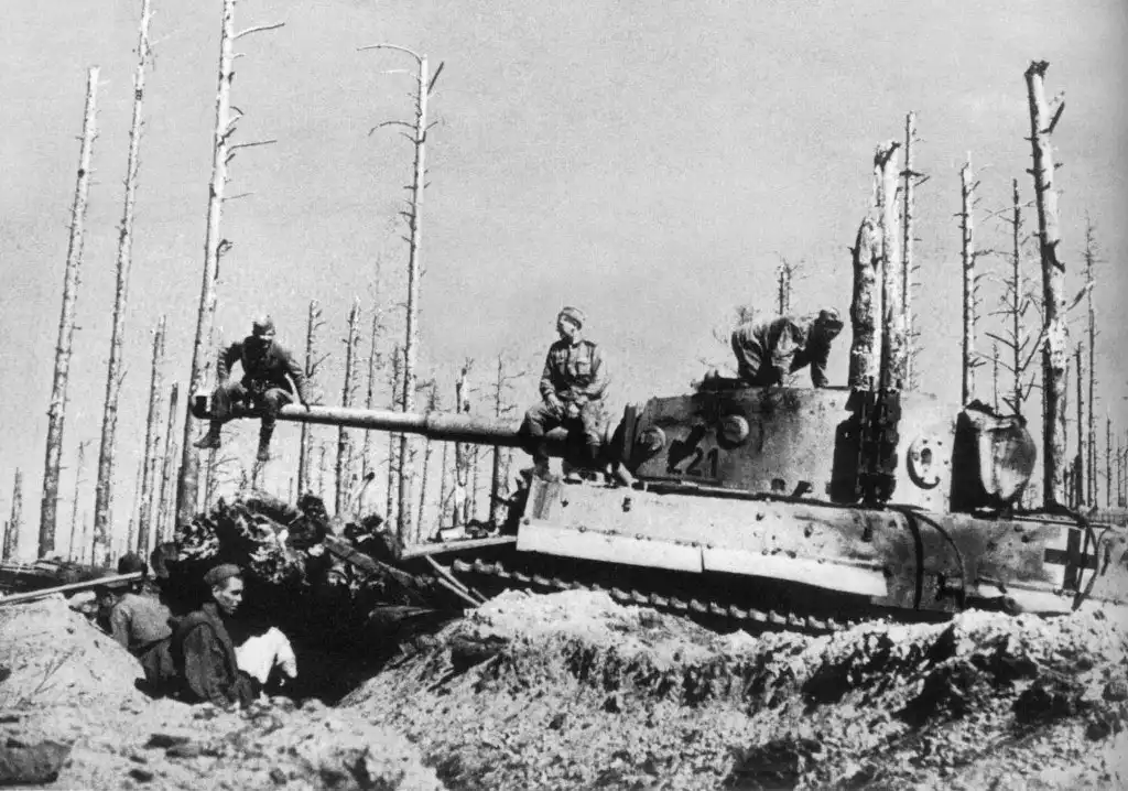 Советские солдаты на немецком тяжёлом танке Pz.Kpfw.VI Tiger Ausf.H1