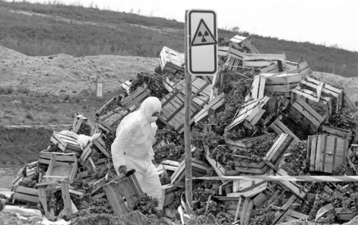 Рабочий в Германии выбрасывает овощи после Чернобыльской катастрофы