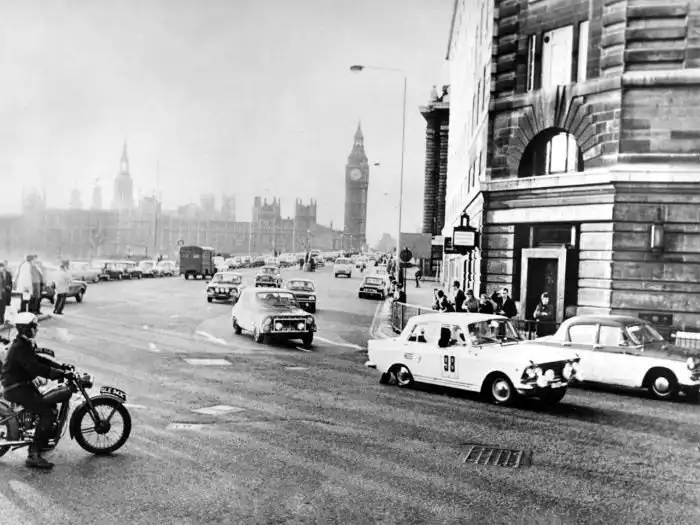Автомобиль "Москвич–412" на ралли Лондон–Сидней, Вестминстерский мост, 1968 год, Лондон