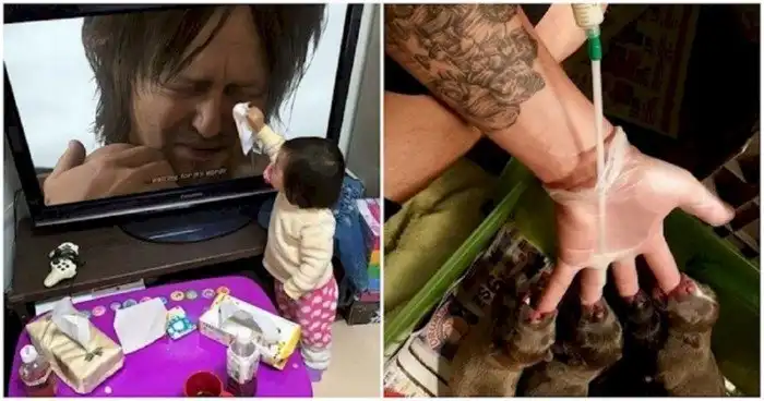 Этот парень придумал гениальный способ выкармливать четверых щенков молоком с помощью кататера и резиновой перчатки