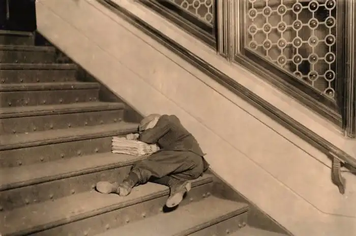 Уставший мальчик-газетчик уснул прямо на ступенях лестницы. Джерси Сити, 1912.