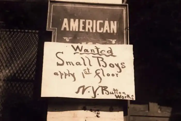 "Требуются маленькие мальчики". Объявление о поиске работников на стене пуговичной фабрики в Нью-Йорке, 1916.