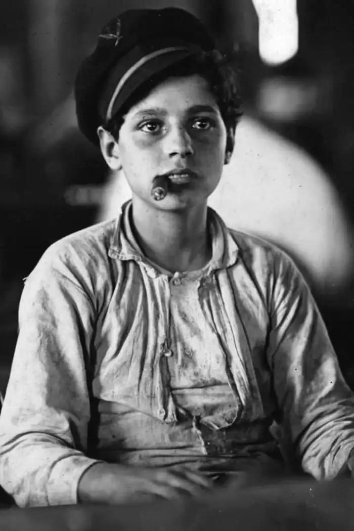 Юный работник сигарной фабрики в Тампе курит сигару во время перерыва в работе. 1909.