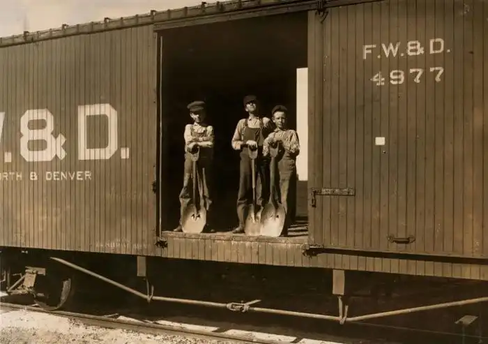 Мальчики-грузчики ждут подвоза с шахты цинка для погрузки его в вагоны. Аврора, Миссури, 1910.