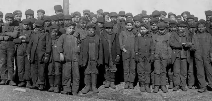 Саут Питтстон, Пенсильвания, 1908 год. Юные шахтеры вместе со взрослыми поднимаются из шахты в конце смены.