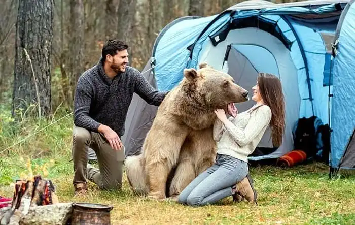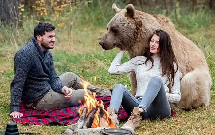Эти фото были сделаны в лесу Подмосковья. В своей фотосессии пара воспроизвела загородный отдых, на который внезапно пожаловал дружелюбный медведь. Получились очень крутые фотографии.