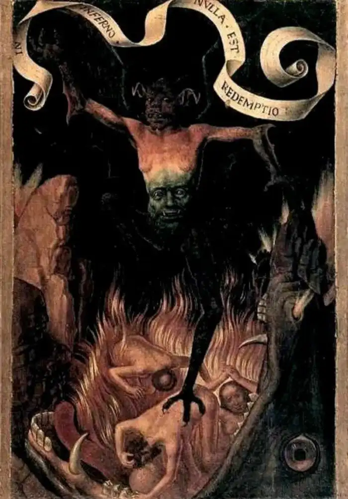 Отвратительный рогатый Дьявол, из живота которого проглядывает человеческое лицо, топчущий грешников, приговоренных к пожиранию огнедышащим монстром, - таков итог человека, не заботящегося в течение жизни о своей праведности.