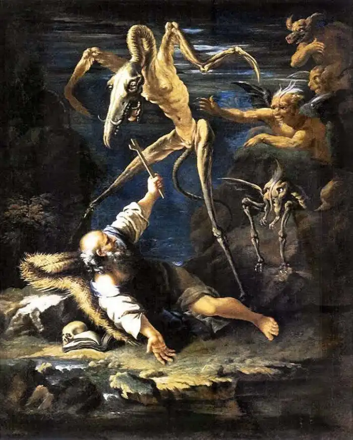 Легенда об искушении святого Антония вдохновляла на творчество многих живописцев: картины с таким названием есть у Иеронима Босха, Поля Сезанна, Сальвадора Дали и многих других. Каждый привносил что-то свое и каждая картина по-своему интересна. По легенде, святой Антоний - набожный христианин - стал паломником и ушел странствовать в пустыню, чтобы жить там в уединении. На пути его подстерегали всякого рода злые искушения и отвратительные демоны, пытающиеся сбить его с истинного пути. Демон в исполнении Сальватора Розы похож на какое-то инопланетное существо. Даже не верится, что картина написана в 17 веке.