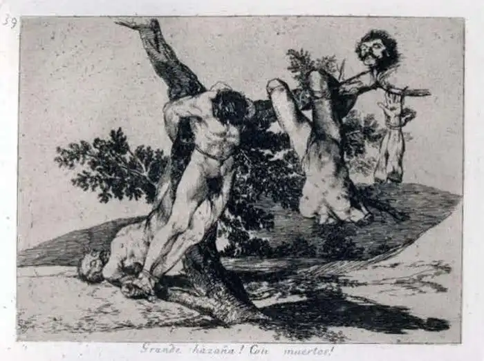 Франсиско Гойя создал серию из 82 гравюр, на которых, как вы уже поняли, тщательно отобразил все ужасы войны. Это был протест против жестокого подавления французами восстания на Пиренейском полуострове, за которым последовала война. Представленная гравюра значится под номером 39 и имеет подпись "Героическая борьба! С мертвецами!". На гравюре изображены подвешенные к дереву трупы. Все они кастрированы, у одного отрублены руки и голова.