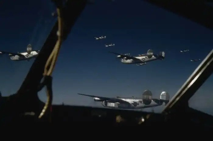 Бомбардировщики B-24 "Либерейтор" 491 полка бомбардировочной авиации по пути на задание. 491 бомбардировочный полк бомбил цели в Северной Франции и Германии с июня 1944 по апрель 1945 года. Среди их целей была и ставка генерального штаба немецкой армии в Цоссене. Полк получил знак "За особые отличия" после того, как 26 ноября 1944 года эфективно провел бомбардировку нгефитеперерабатывающего завода в Мисбурге, несмотря на то, что половина машин полка накануне была уничтожена вражеской авиацией.