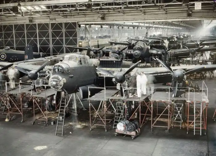 Завершающий этап сборки бомбардировщиков "Ланкастер" на заводе в Вудфорде. В общей сложности, за время войны в Вудфорде было собрано более 3000 бомбардировщиков.
