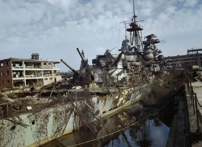 Немецкий военный корабль "Адмирал Гиппер" ржавеет в доке. Май, 1945.