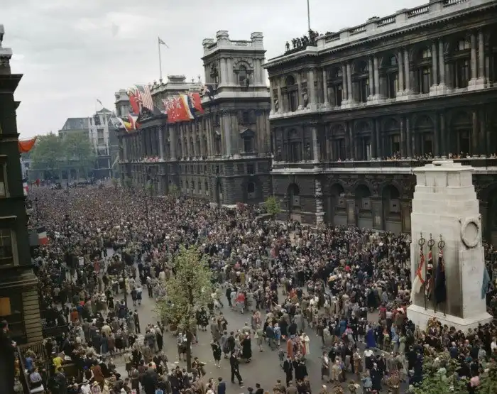 Толпа британцев празднует День победы у монумента неизвестному солдату в Уайтхолле. 8 мая 1945 года.