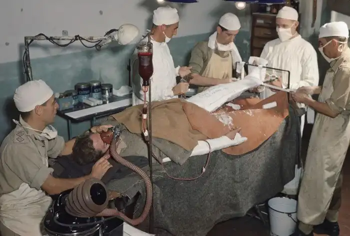 Врачи делают переливание крови раненому британскому солдату на полевом перевязочном пункте в Италии. Октябрь, 1944.