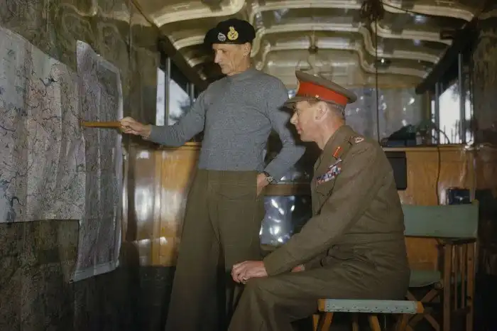 Фельдмаршал сэр Бернард Монтгомери объясняет стратегию союзнических армий королю Георгу VI в своем передвижном командном пункте в Голландии в октябре 1944 года. Король Георг, носивший звание фельдмарщала, адмирала флота и маршала авиации, регулярно приезжал в войска и всегда в этих случаях облачался в свою военную форму.