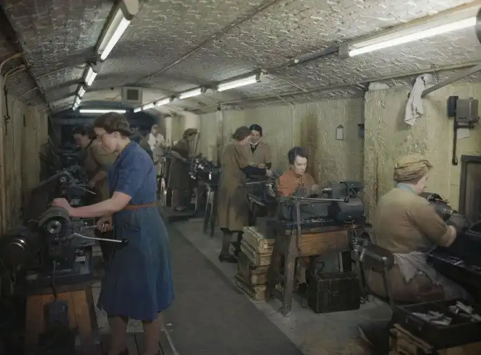 Женщины работают на производстве пуль и снарядных гильз на подземном заводе боеприпасов в Уиррале, Мерсисайд, 1945. Более миллиона британских женщин работали на производстве вооружений и амуниции вплоть до 1945 года, зачастую с утра до ночи и без выходных.