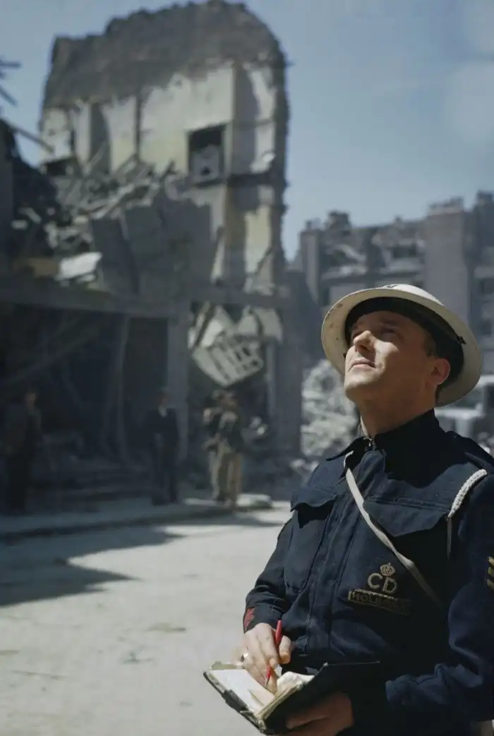 Инспектор Службы противовоздушной обороны осматривает разрушенные во время налета дома. Служба ПВО была создана в Британии в 1938 году для защиты гражданского населения от авиаударов. В частности, она включала в себя штат инспекторов, в обязанности которых входило докладывать о прошедших налетах.