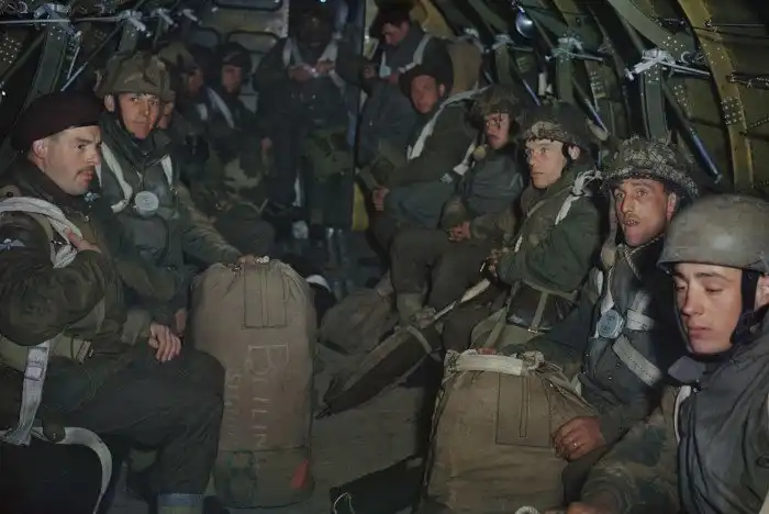 Деревня Даун Эмпни, Уилтшир, 22 апреля 1944 года. Британские парашютисты готовятся к тренировочному прыжку с борта "Дакоты".