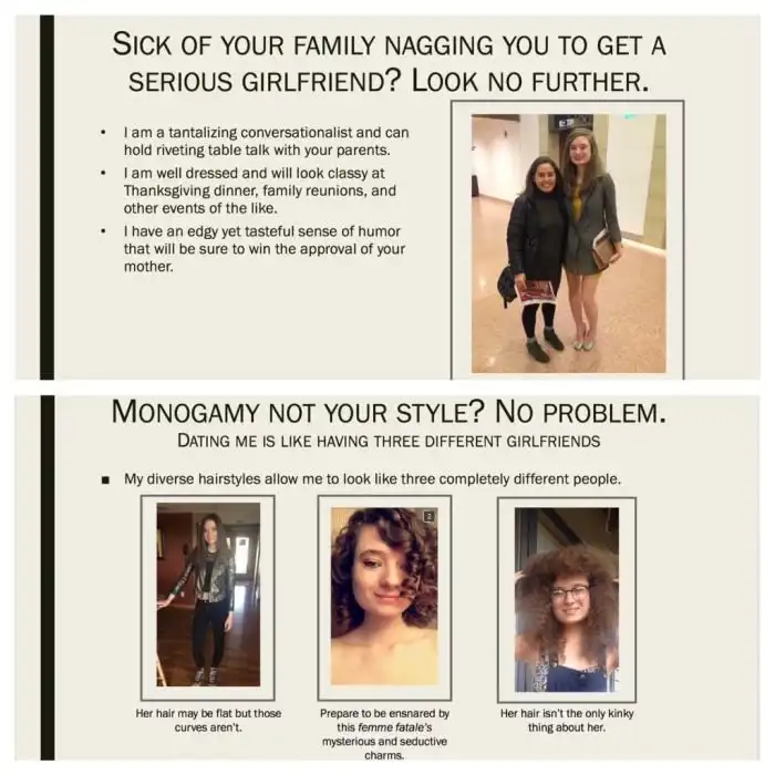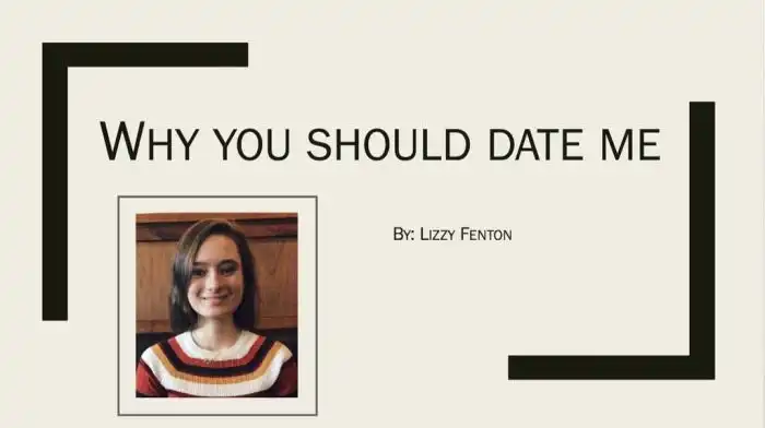 Презентация под названием «Почему тебе следует со мной встречаться» была разделена на несколько пунктов с основными тезисами.