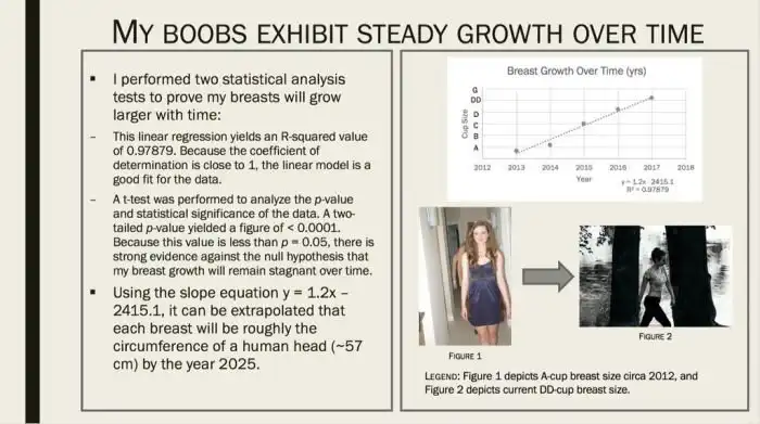 В третьем пункте презентации Фентон обратила внимание на рост своей груди. «Моя грудь демонстрирует устойчивый рост на протяжении долгого времени», - пишет Лиззи. По ее расчетам, к 2025 году обхват одной ее груди может достичь 57 сантиметров.