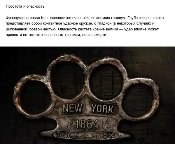 Одним из самых простых видов оружия, используемых в уличных драках, является кастет. У многих из нас кастеты ассоциируются с чем-то бандитским и нелегальным, ведь на территории России ношение и покупка кастетов запрещена. Широкое распространение кастеты получили в XX веке, однако их история начинается еще в древности, именно об этом речь пойдет далее.