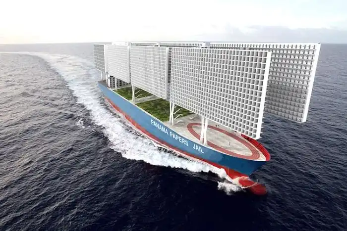 Три архитекторов из парижской Школы архитектуры представили проект плавучей тюрьмы Panama Papers Jail. Аксель де Стампа (Axel de Stampa), Сильвен Мако (Sylvain Macaux) и Гийом Дево (Guillaume Devaux) предложили использовать судно-тюрьму для фигурантов финансового скандала, связанного с «Панамскими документами». Гигантский корабль с открытыми камерами, согласно плану создателей, сможет вмещать 3300 заключенных, у каждого из которых будет отдельная камера на 9 квадратных метров. В соединенных друг с другом корпусах также предлагается обустроить мастерскую, административный центр и столовую. Помимо этого в носовой части останется место для спортивного поля, в центральной части можно обустроить несколько полей для выращивания сельхозкультур, на корме - разместить корпус для персонала, а в грузовом трюме - устройство для опреснения воды. Идеальным местом для базирования корабля станут международные воды вблизи Панамы, считают авторы проекта.