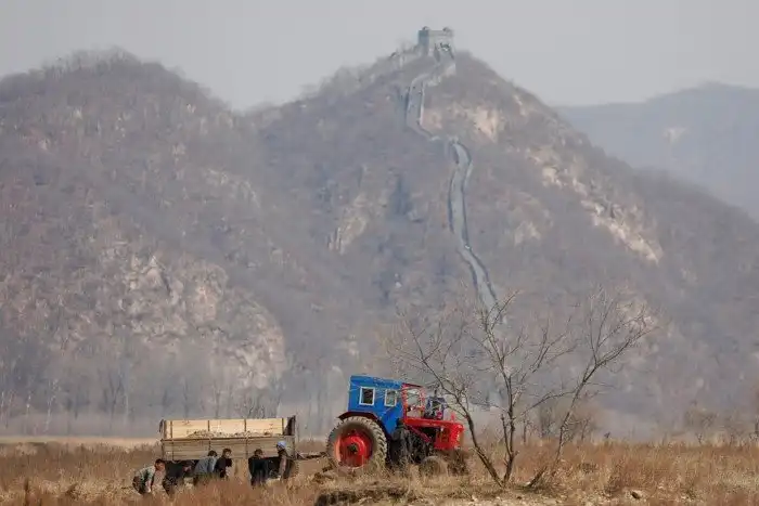 Северокорейские фермеры работают в поле на границе, 2 апреля 2017. (Фото Damir Sagolj | Reuters):