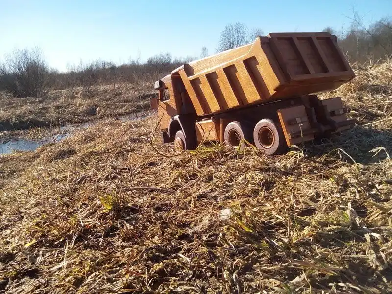 Житель Гатчины Артём Петмансон сделал КАМАЗ-65115 из дерева. Грузовик выполнен из бука и березы. Кабина откидывается, кузов поднимается. У машины рабочая задняя подвеска и рулевое с тягами. Всё сделано из дерева ручным инструментом без саморезов и винтов. Размер (см): 50*18*23.