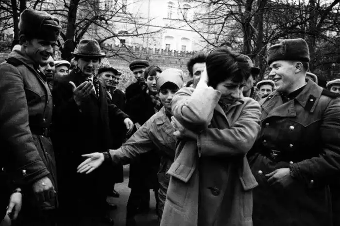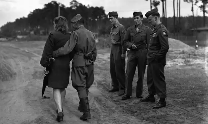 Советский солдат, гуляющий с немецкой девушкой, в сопровождении американских военных