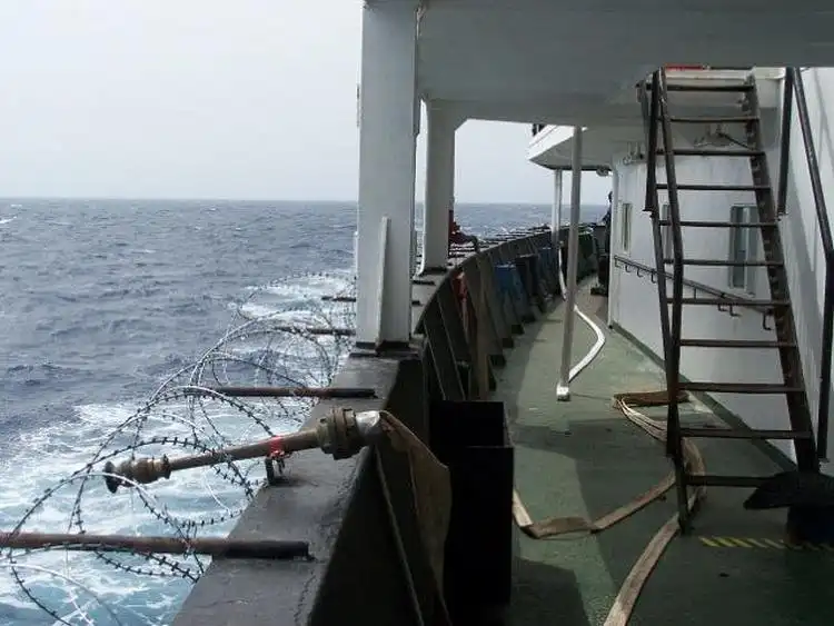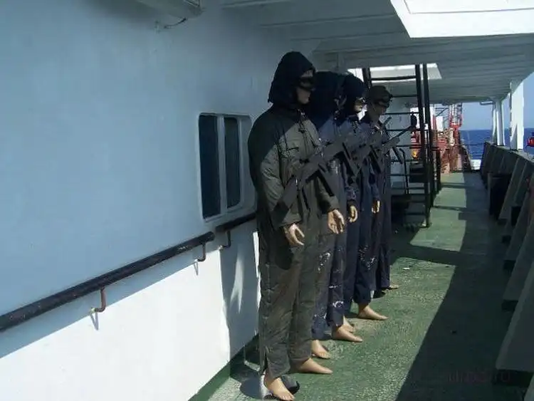 Мы недавно показывал как охранные компании расстреливают в открытом море пиратов. Но что делать если у судовладельца ограничен бюджет? Тогда на помощь приходит флотская смекалка и корабль издали напоминает неприступную крепость.