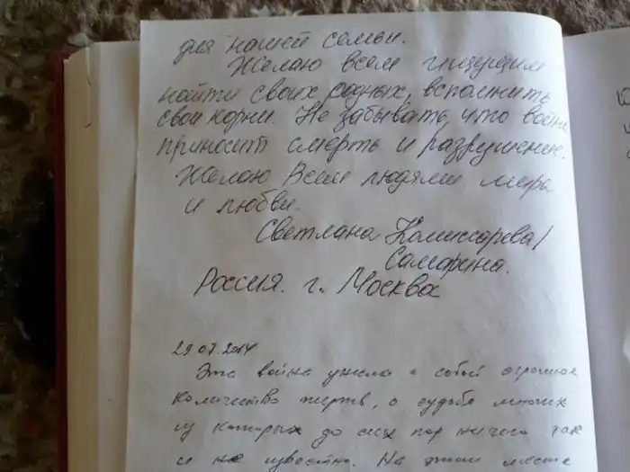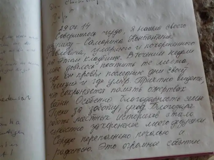 В часовне есть тетрадь, в которой можно оставить свои комментарии. Одна из записей рассказывает о том, как внучка одного из военнопленных нашла могилу своего дедушки.