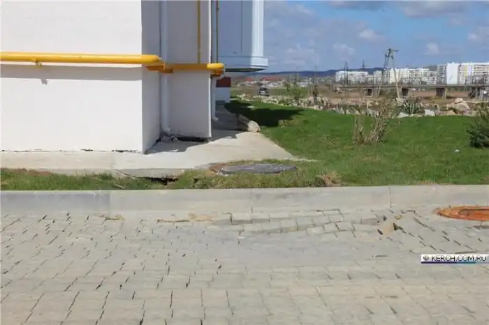 Построенные в Керчи новые трехэтажные дома для переселенцев не смогли пройти испытания первыми дождями. Из-за низкого качества проделанных работ на тротуарных дорожках стали появляться провалы, просел цоколь одного из домов, образовав большую трещину, а подвал заполнился водой. Последствия дождей прекрасно видны на этих фото.