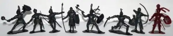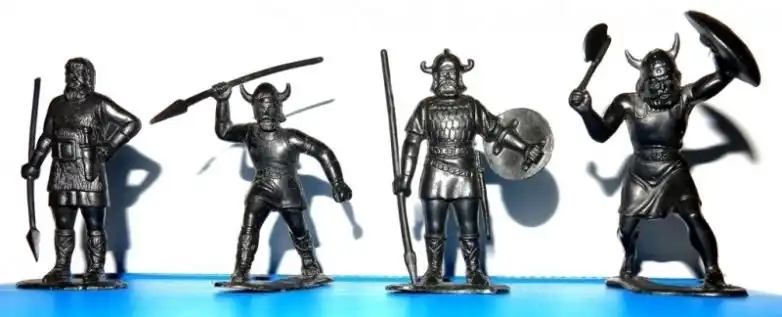 «Викинги» (PO80-03): 8 фигурок, 60 мм. На подставке большой и маленький следы от толкателей. Цвета: зеленый; желтый (оранжевый); коричневый; кофейно-молочный; красный; серый; голубой; черный. На самых первых фигурках стояло клеймо «Маrx Taiwan». Ограниченная партия фигурок выпущена из ПВХ (зеленые, синие, серые).