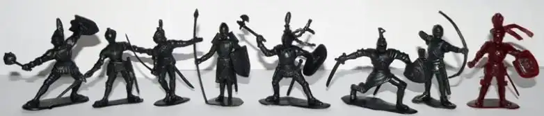 «Римляне» (PO80-02): 8 фигурок, 60 мм. На подставке большой, с номером, и маленький следы от толкателей. Цвета: зеленый; кофейно-молочный; красный; серый; голубой; черный. На самых первых фигурках стояло клеймо «Маrx Taiwan».