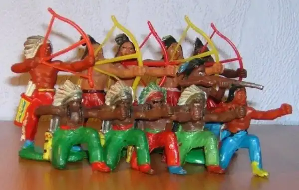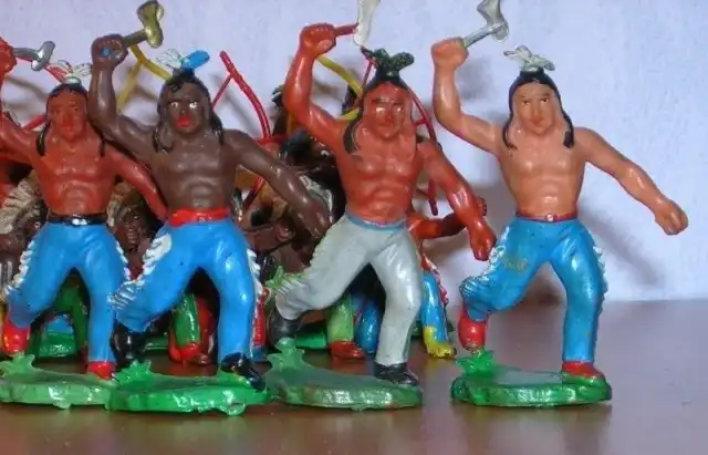 «Индейцы» (PO80-08): изначально 8 фигурок, затем 7, 60 мм. На подставке большой, с номером, и маленький следы от толкателей. Цвета: кофейно-молочный; коричневый; красный (вишневый); темно-зеленый; голубой; черный. Фигурка раненого индейца из-за дефекта пресс-формы в конце 70-х была снята с производства. Одно время в продажу поступали наборы с раненым индейцем без стрелы. На самых первых фигурках стояло клеймо «Hong Kong». Ограниченная партия фигурок выпущена из ПВХ (красные, голубые).