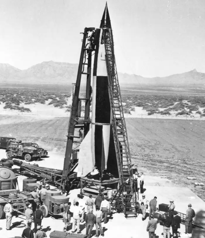 Немецкая баллистическая ракета «Фау-2», захваченная американцами в Германии перед испытательным пуском на полигоне Уайт-Сэндс. Штат Нью-Мексико. США. 10 мая 1946 года.