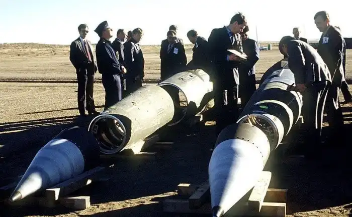Советские инспекторы осматривают уничтоженные ракеты Pershing II в соответствии с Договором РСМД . США. Январь 1989 год.