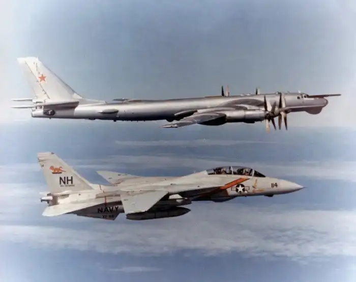 Самолет США Grumman F-14A истребительной эскадрильи VF-114 Аардваркс сопровождает советский самолет Ту-95РТ в нейтральных водах. Тихий океан. 1983 год.