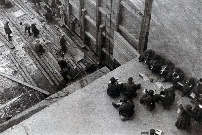 Рабочие и оркестр на строительстве Беломорско-Балтийского канала. Автономная Карельская ССР. СССР. 1931-1933 годы.