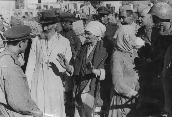 в кругу местных жителей беседует с красноармейцами, освободившими город Анапу. Краснодарский край, 22 сентября 1943 года.