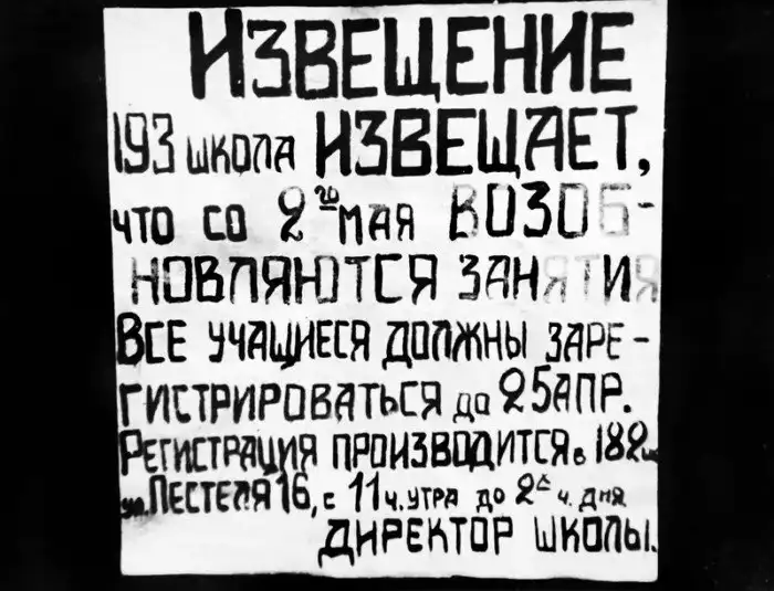Извещение о возобновлении занятий в школе № 193 Ленинграда.