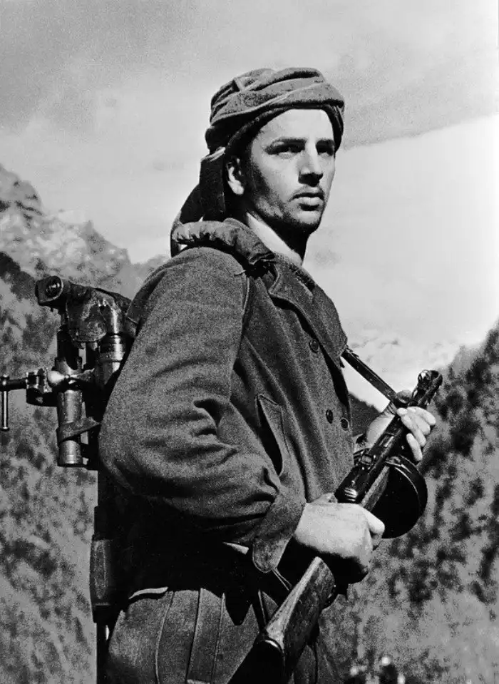 Солдат-абхазец с пистолетом-пулемётом ППШ в горах Кавказа, август 1942 года.
