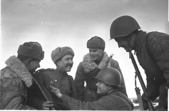 Красноармейцы рассматривают Георгиевский крест товарища. Рядом с крестом, орден Красной Звезды.