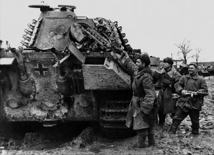 Советские солдаты осматривают захваченную в городе Умань «Пантеру» через три дня после освобождения города от захватчиков 10 марта 1944 года.