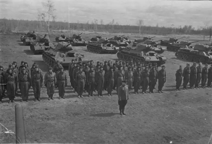Личный состав 221-го отдельного Перновского танкового полка получает танковую колонну «За советскую Эстонию». Калининский фронт, 6 мая 1943 года.