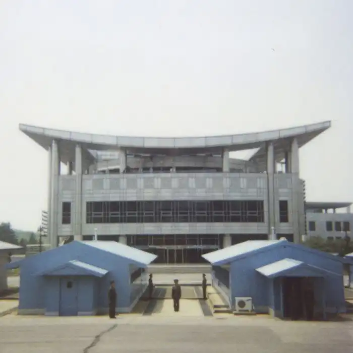 "КПП на границе с Южной Кореей. Ни американских, ни южнокорейских солдат с другой стороны не видно. Гид заявил, что они боятся, что их увидят, потому что "они трусы".
