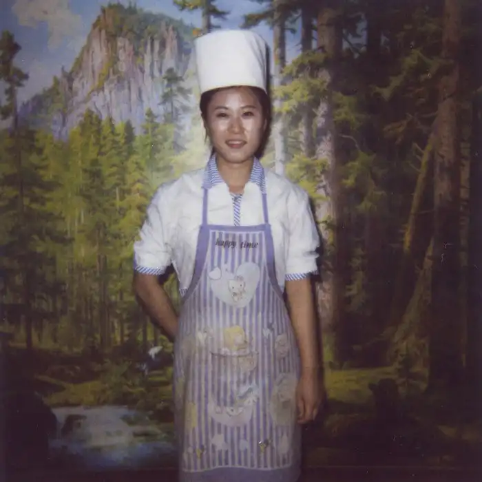 "Повар в ресторане Пхеньяна. Она не знает о персонаже Hello, Kitty, нарисованном у нее на фартуке, и считает, что это какой-то персонаж северокорейских мультфильмов".